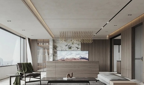 想要隐藏电视设计,我们还可以选择卷轴电视。至于作用:更有科技感,更美观。或许,还可以迷惑小孩?