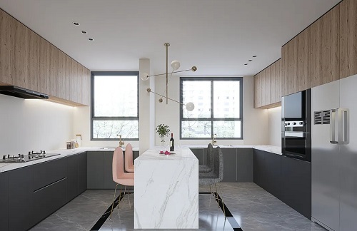 L型布局利用相邻两面墙体空间,适合长方形厨房。